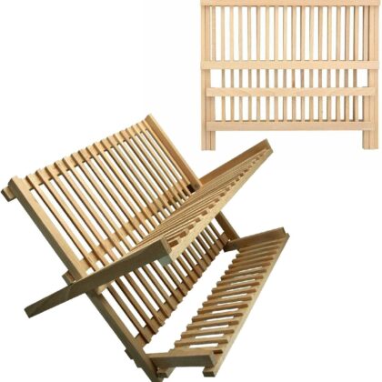 ARUUJ Beechwood Folding Dish Drainer – Kitchen Foldable Dish Drying Rack – Plates, Cups, Bowls, Utensils Storage Holder – 2 Tier Wooden Dish Drainer Rack – H 35 x W 40 x D 30 cm