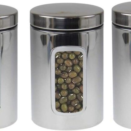 ARUUJ 3pcs Stainless Steel Kitchen Canister jar Set – Tea, Coffee, Sugar Container Multi Food Storage Jars – Secure Lids & Glass Front Viewing Window Kitchen Counter Top Essential Jars (Silver Jars)