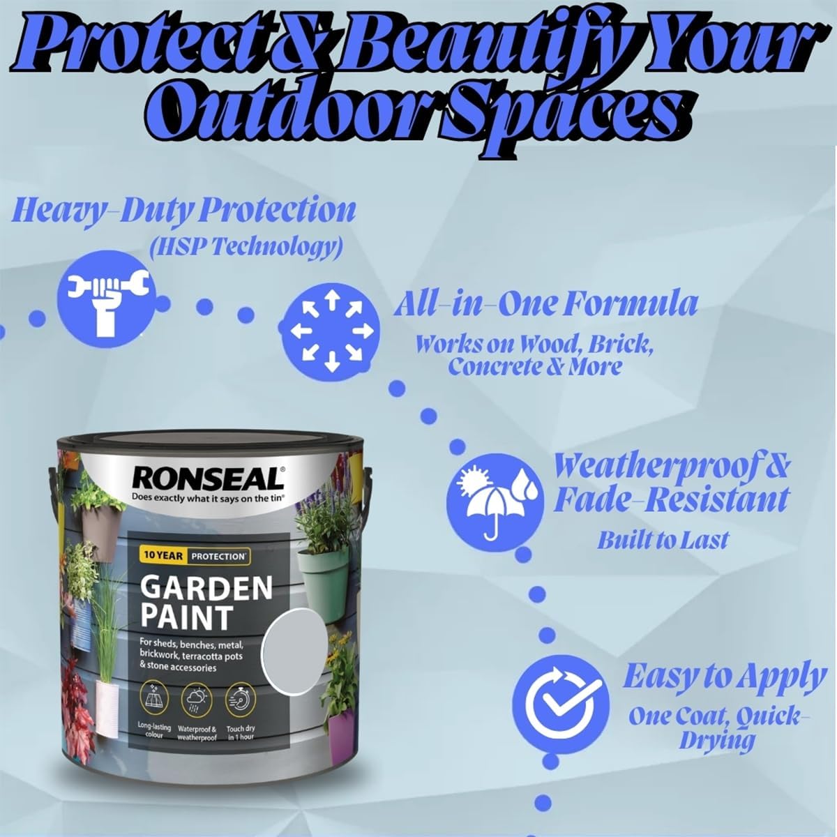 - 【Available in Multiple Sizes】Whether you’re tackling a small DIY project or a large outdoor renovation, this garden paint is available in various sizes to suit your needs. Choose from 0.25L, 0.75L, 2.5L, and 5L tins, ensuring you have the right amount for any task. The smaller sizes are perfect for touch-ups and decorative accents, while the larger options provide enough coverage for full fences, garden walls, and sheds, making it a flexible choice for any outdoor painting job.