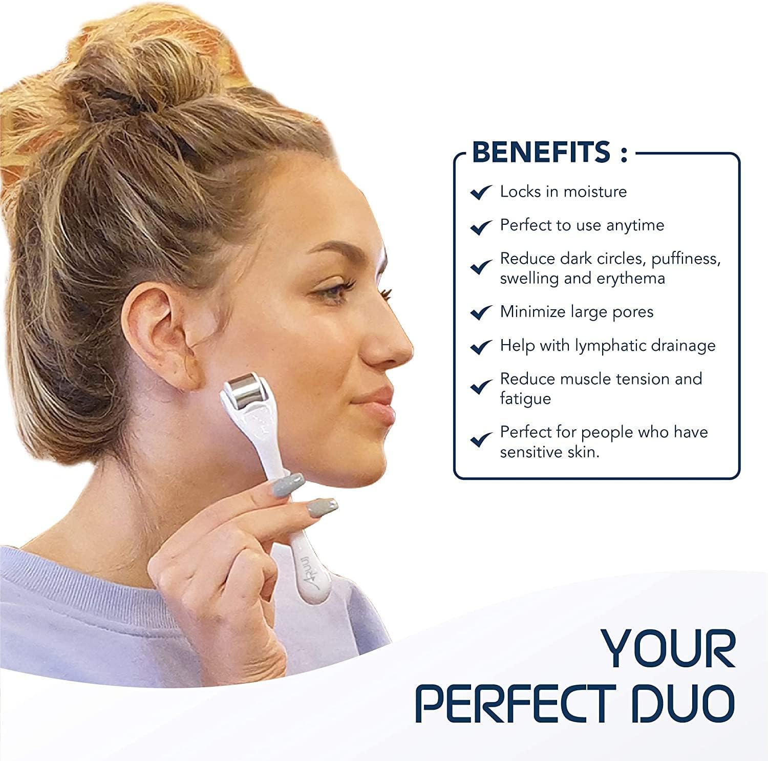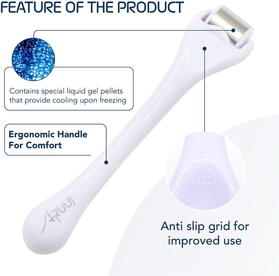- : ARUUJ Professional Ice roller with plastic head and metal casing filled with gel pellets provides cooling for pain relief and skin rejuvenation. Ideal for reducing dark circles, puffiness, swelling, erythema, large pores, and muscle tension. Perfect for lymphatic drainage, fatigue, and as a cooler post-derma roller use, locking in moisture after applying serum or moisturizer.
